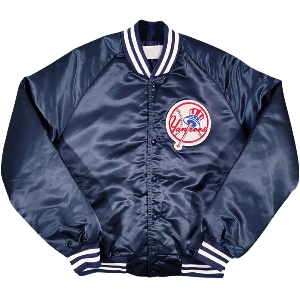The 80’s NY Yankees Satin Jacket is a timeless piece that brings back the golden era of baseball fashion. With its sleek satin finish, classic navy blue shade, and Yankees logo on the chest, it captures the spirit of vintage sportswear effortlessly.