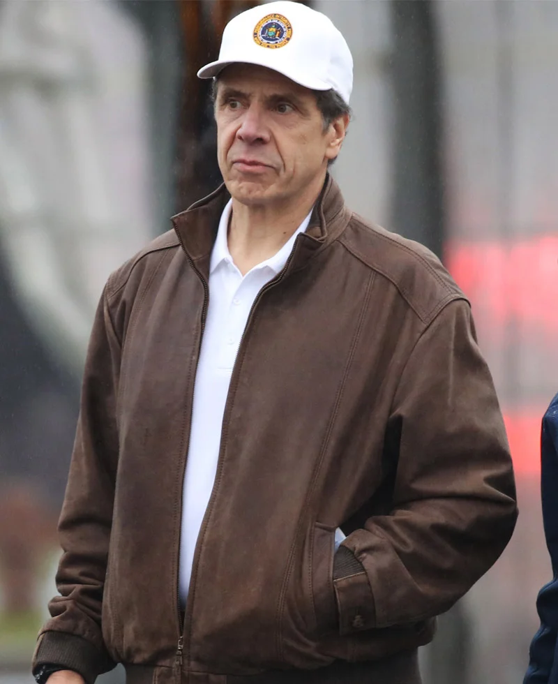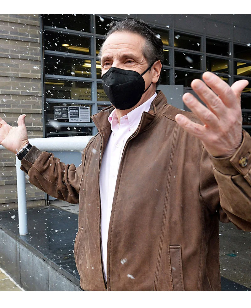Inspired by the style of New York Governor Andrew Cuomo, this brown leather jacket is crafted from premium genuine leather with a soft viscose lining for comfort and warmth. Featuring a stand-up collar, front YKK zipper closure, rib-knitted buttoned cuffs, ribbed hemline, and waist pockets, this jacket offers a clean, classy, and modern look.