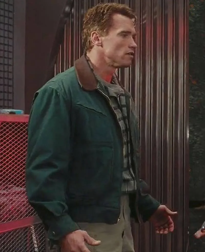 Inspired by the sci-fi thriller Total Recall, this Arnold Schwarzenegger green cotton jacket is worn by Douglas Quaid. Made from premium cotton with a soft viscose lining, it provides comfort and style. Featuring a shirt-style collar, front zipper closure, buttoned cuffs, fitted hem, and multiple pockets, this jacket is perfect for casual outings and movie-inspired looks.