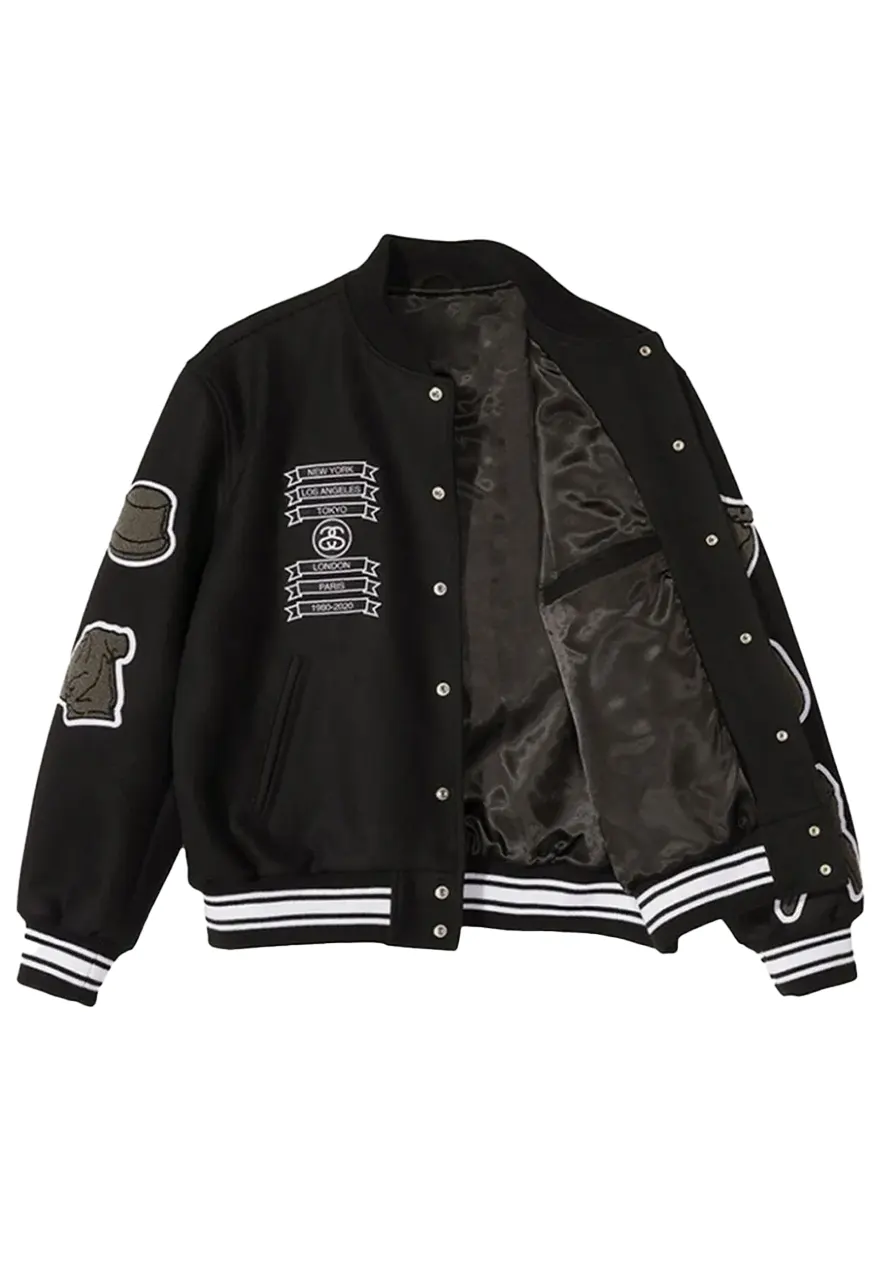 The Asap Rocky Stussy Cdg Wool Varsity Jacket is an Essential Outfit for This Winter to Own an Adorable Personality While Staying Warm and Cozy. The Premium Quality Wool Fabric Makes It Warm and Ageless and It’s Soft Viscose Inner Will Comfy You for How Long You Wear It. The Strong Black Color Will Increase Your Smartness. The Cdg Asap Rocky Stussy Black Jacket Has Been Designed by Using Features Like Rib-knitted Stand-up Collar, Snap Tab Buttoned Closure, Rib-knitted Cuffs and Hemline, and Side Waist Pockets. The Stussy Cdg Will Leave You With Enchanted Looks That Will Rule the Hearts of All Around You.