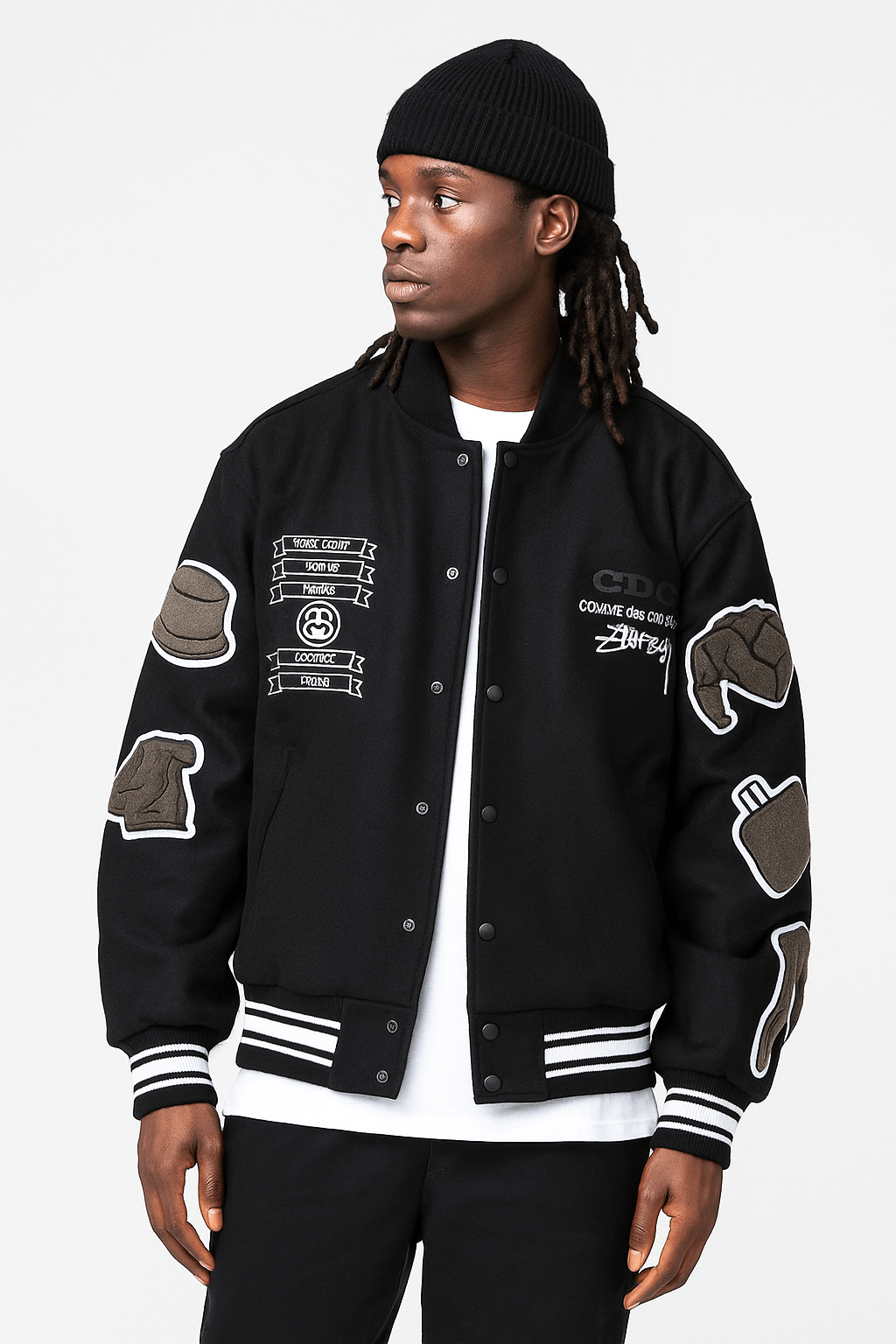 CDG ASAP Rocky Stussy Black Wool Varsity Jacket