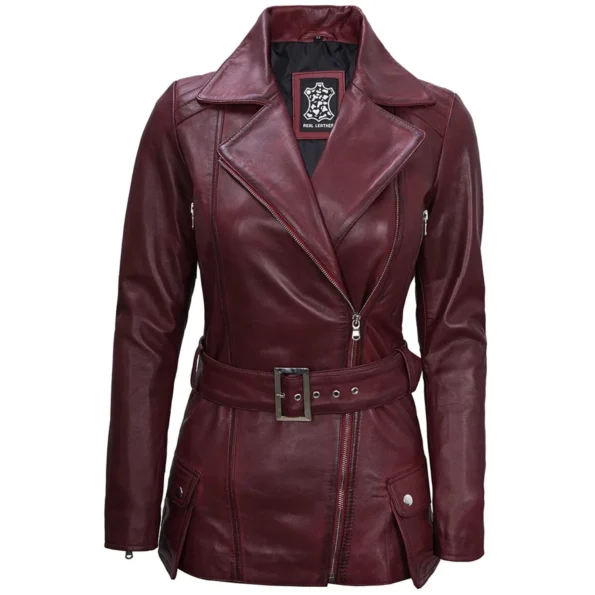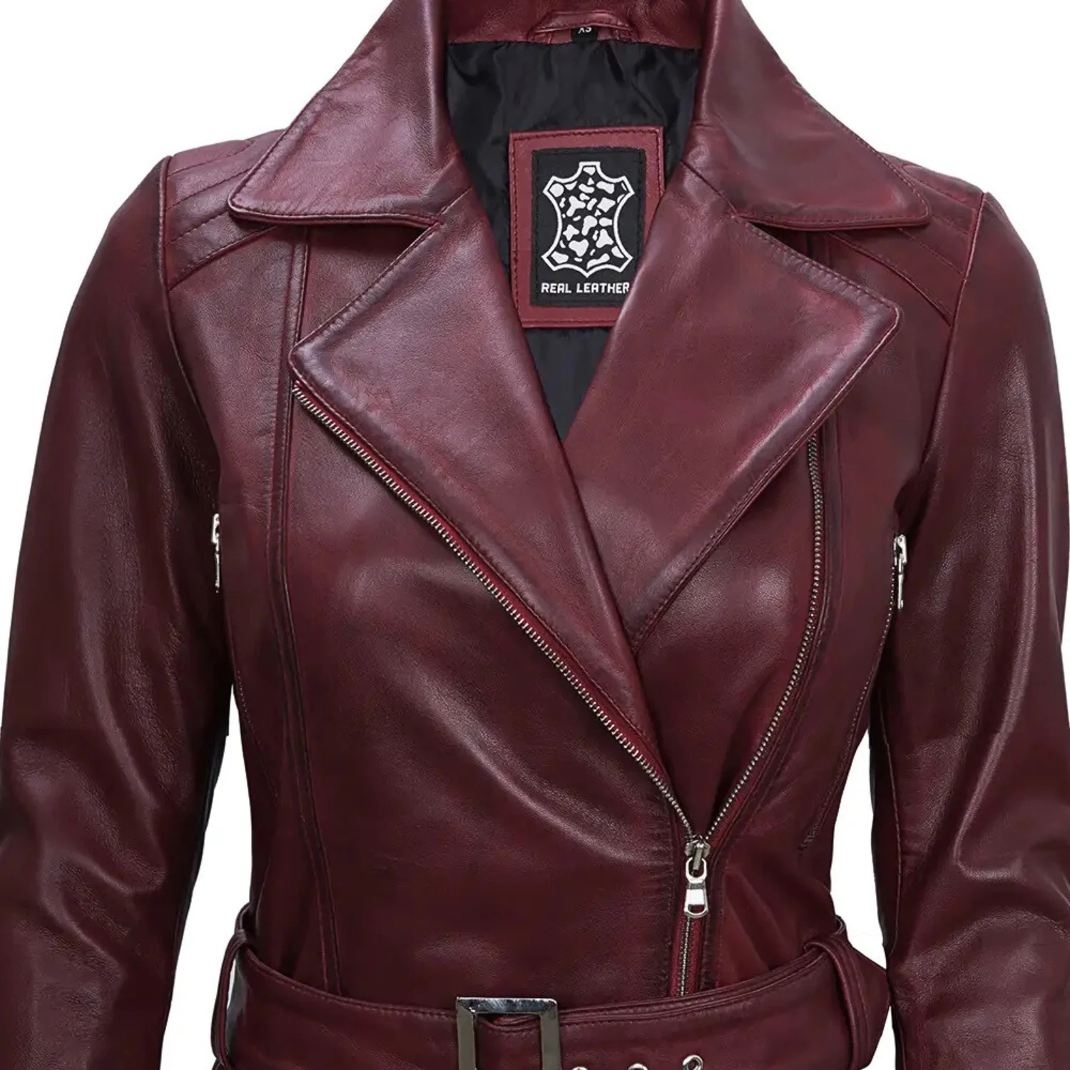 Maroon Womens Asymmetrical Leather Biker Jacket