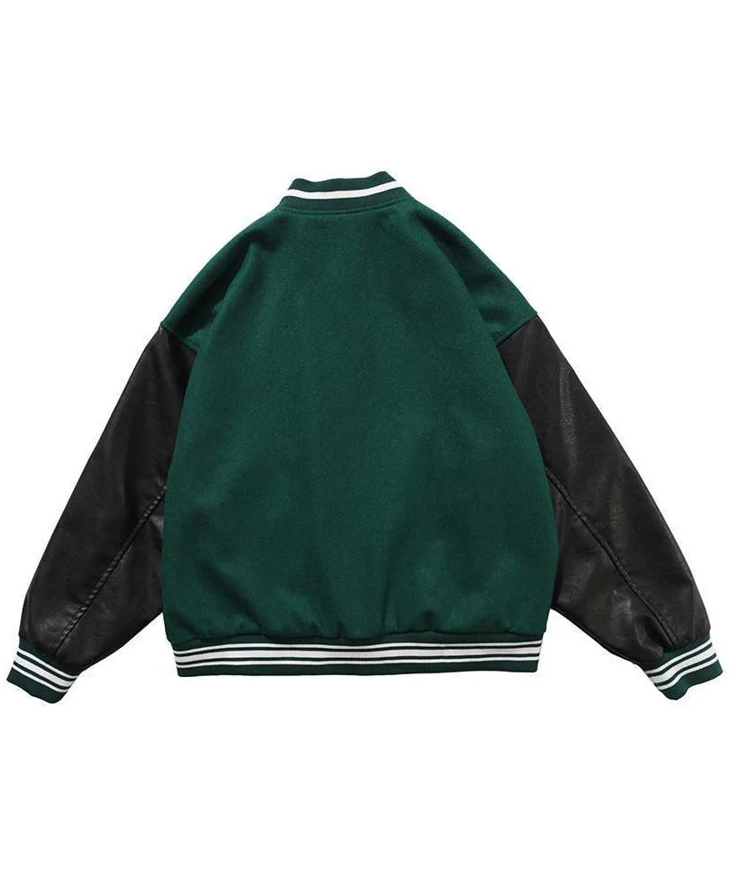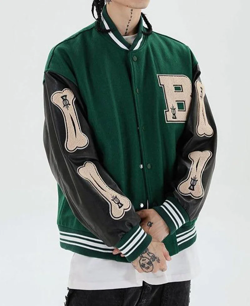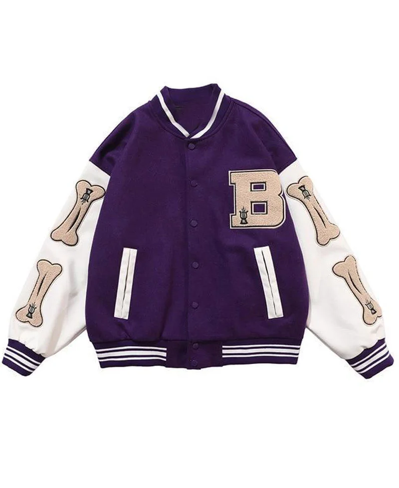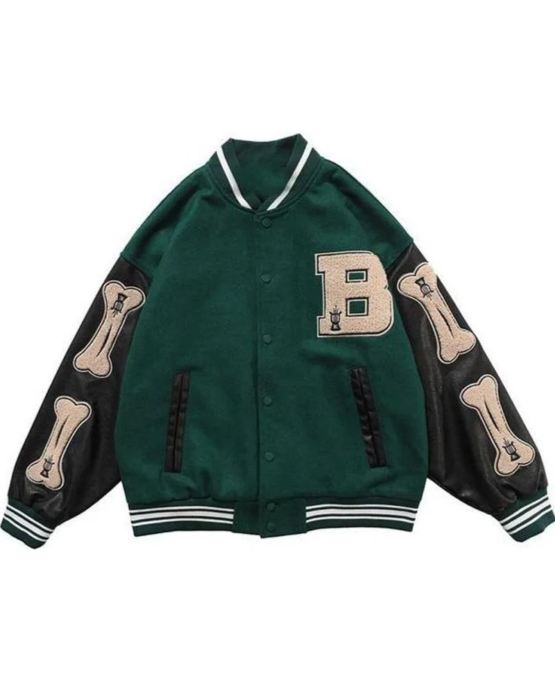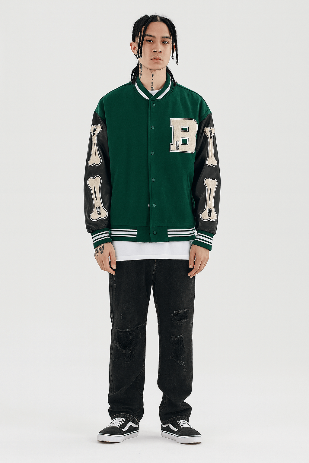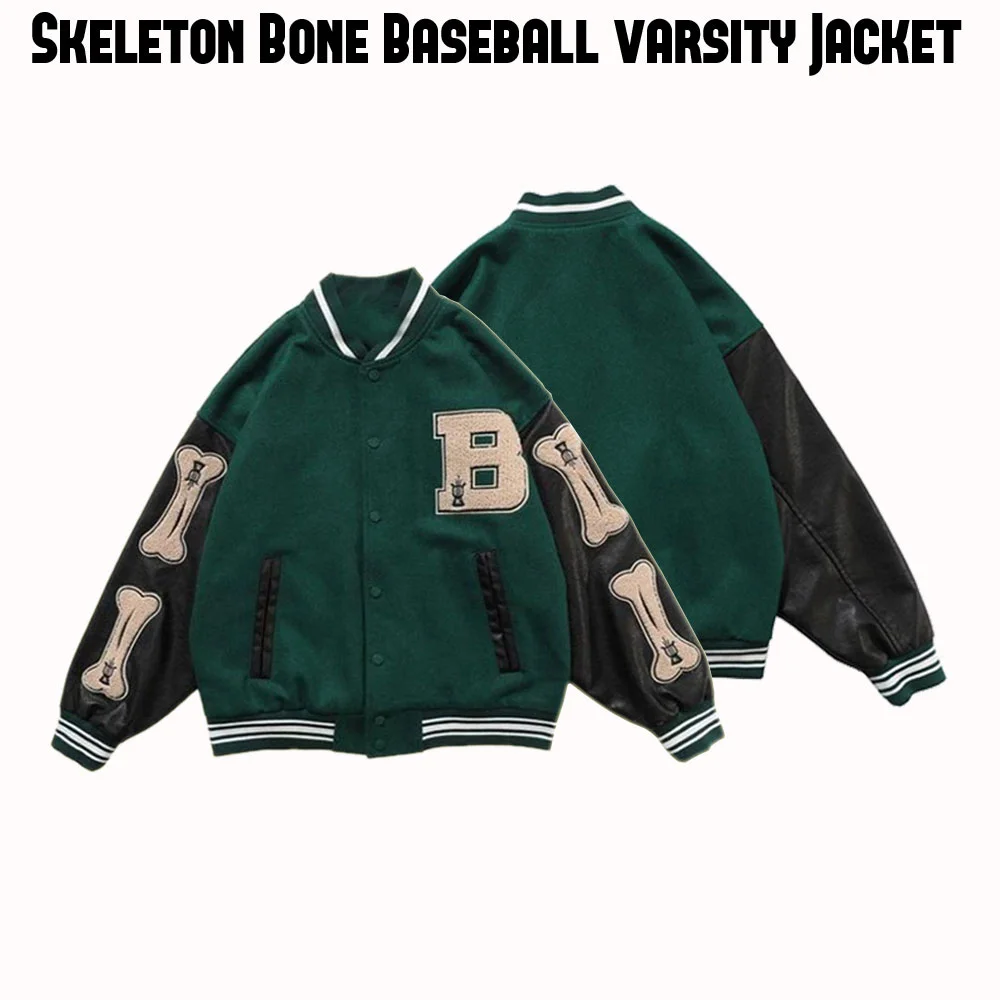The Bad to the Skeleton Bone Patchwork Jacket is the perfect blend of bold street style and classic varsity fashion. Available in striking colors like purple, black, and green, it features a premium wool body with genuine leather sleeves for a durable, high-quality finish. The soft viscose lining keeps you warm and comfortable, while the button closure, rib-knitted collar, cuffs, and hemline add a traditional varsity touch. With eye-catching bone patchwork and practical waist pockets, this unisex jacket delivers standout style for both men and women.