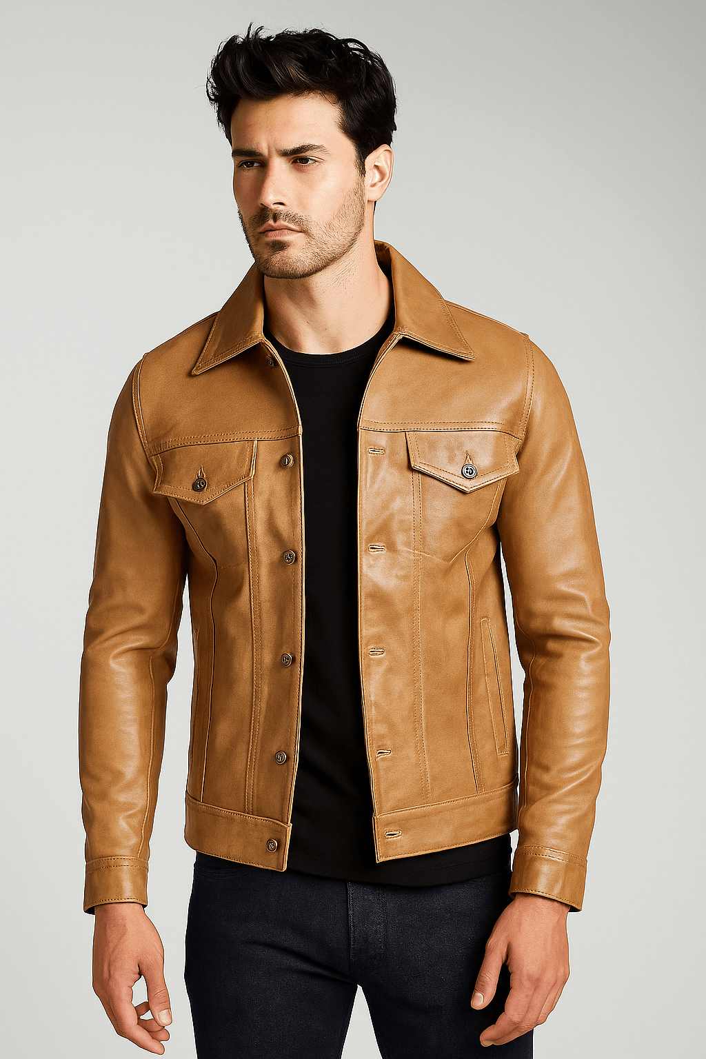 Elevate your wardrobe with this classic brown leather trucker jacket. Designed for versatility, it features a structured fit, premium leather, and traditional button-front closure. Whether you’re going for a vintage look or modern edge, this jacket pairs effortlessly with jeans, chinos, or layered outfits.