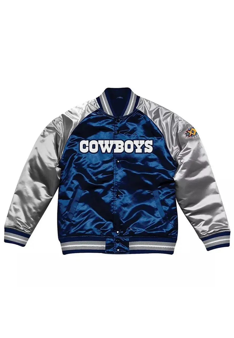 If Your Passion Lies in Sports and You Adore Sporting Jackets, Then the Dallas Cowboys Navy Blue and Silver Varsity Jacket Stands as an Unparalleled Choice. Crafted From High-quality Satin, This Jacket is Not Only Lightweight but Also Versatile for Year-round Use. Its Gentle Viscose Lining Guarantees Day-long Comfort. Moreover, the Combination of Blue and Silver Colors Elevates Your Allure to New Heights. The Dallas Cowboys Jacket Showcases Expert Craftsmanship, Highlighted by Its Elegant Rib-knitted Stand-up Collar, Snap Tab Buttoned Closure, and Thoughtful Dual Side Waist and Inner Pockets making it a Must-have Addition to Your Wardrobe. The Dallas Cowboys Satin Jacket Adds a Touch of Edgy Sophistication to Your Outfit.