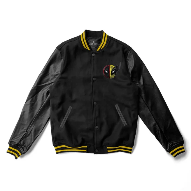 Unleash your inner anti-hero style with the Deadpool & Wolverine Black Jacket, inspired by the iconic Marvel duo. Crafted from premium wool with sleek leather sleeves, this jacket blends comfort with a bold, edgy design. The soft viscose lining ensures all-day ease, while the rib-knitted collar, cuffs, and hemline add a classic varsity touch. Featuring a snap-tab buttoned closure and two side pockets, this jacket is both practical and stylish. Its versatile black color makes it a perfect choice for fans of the legendary Deadpool and Wolverine, or anyone looking to add superhero flair to their wardrobe.