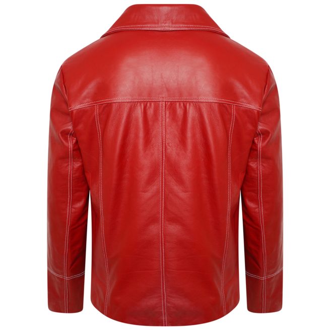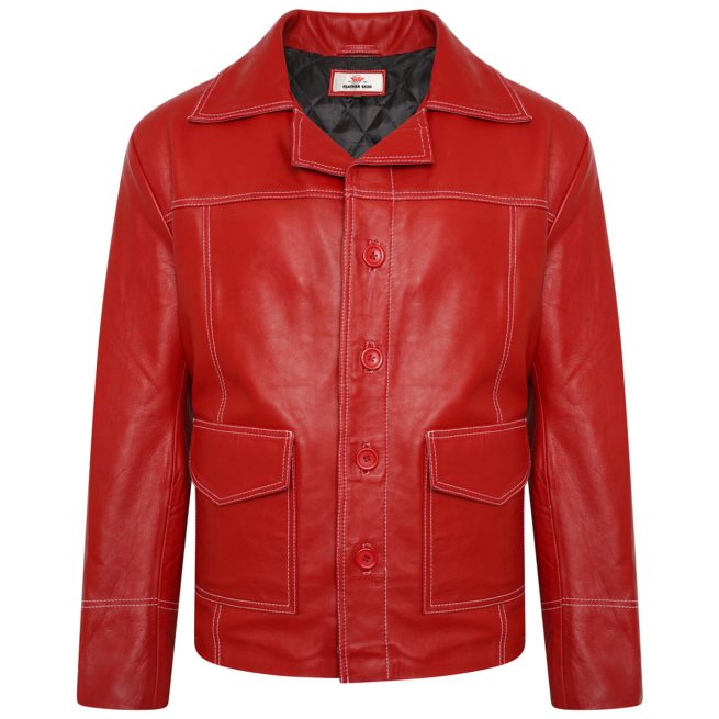 Step into the rebellious style of Tyler Durden with the Fight Club Brad Pitt Red Leather Jacket, a timeless symbol of bold fashion. Crafted from 100% genuine leather, this jacket combines durability with a smooth finish, while the soft viscose lining ensures lasting comfort. The peak lapel collar, buttoned front closure, and zippered cuffs add to its edgy design, making it an instant standout. With its vibrant red color and practical side pockets, this jacket captures the perfect mix of Hollywood-inspired flair and street-style confidence.