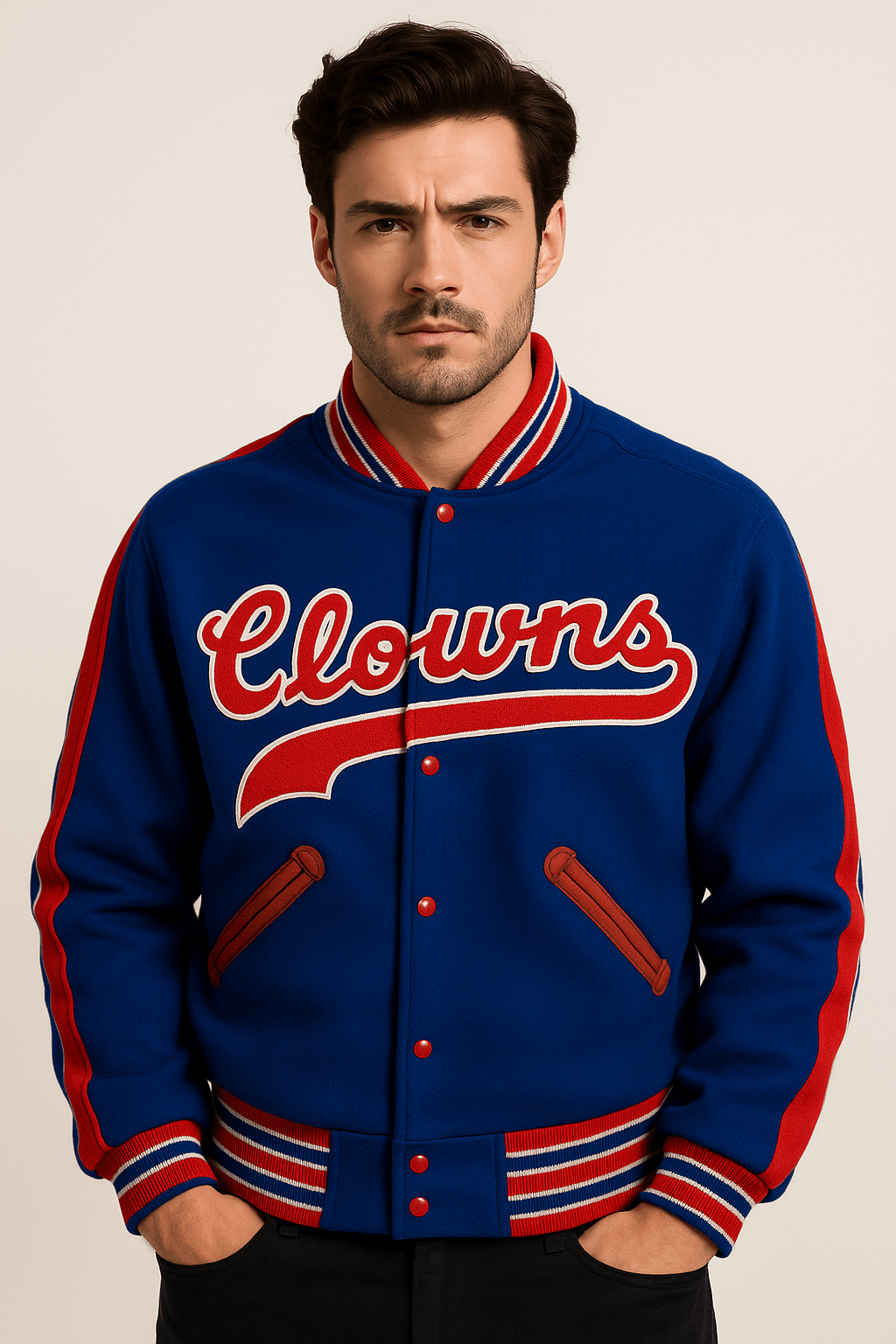Featuring a rib-knitted collar and cuffs, full-length sleeves, a buttoned closure, and two practical side pockets, it balances style with functionality. The rich blue color and authentic design pay homage to the iconic 1951 Indianapolis Clowns, making it a must-have for collectors, sports fans, and vintage fashion enthusiasts alike.