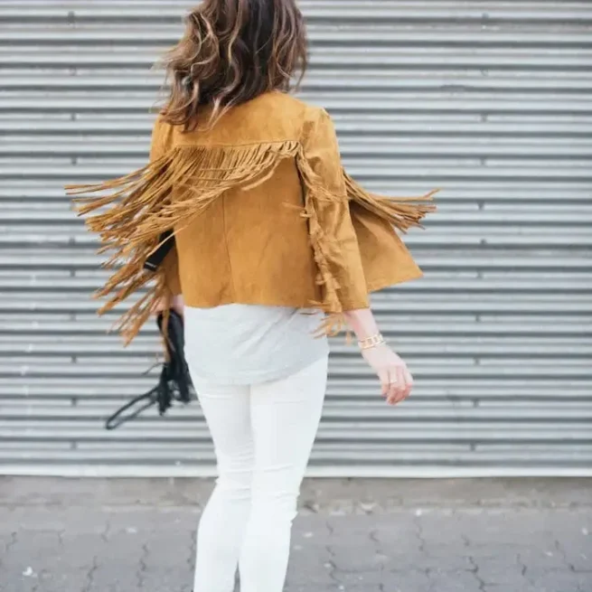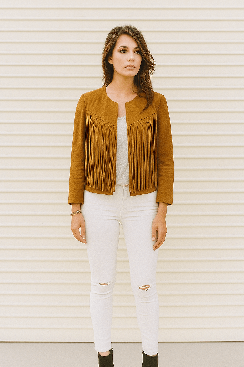 Perfect for festivals, casual outings, or layering with denim and boots, this Jillian Harris-inspired fringe jacket is a must-have statement piece for fashion-forward wardrobes.