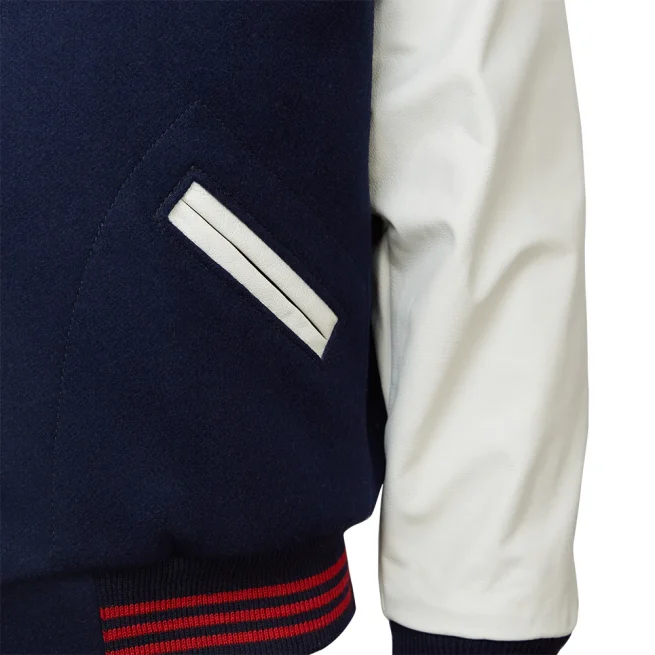 The buttoned closure, rib-knitted collar, cuffs, and hemline enhance its retro appeal, while the two side pockets add practicality. Its striking navy and white color combination reflects vintage athletic fashion, making it a standout addition to any fan’s collection.