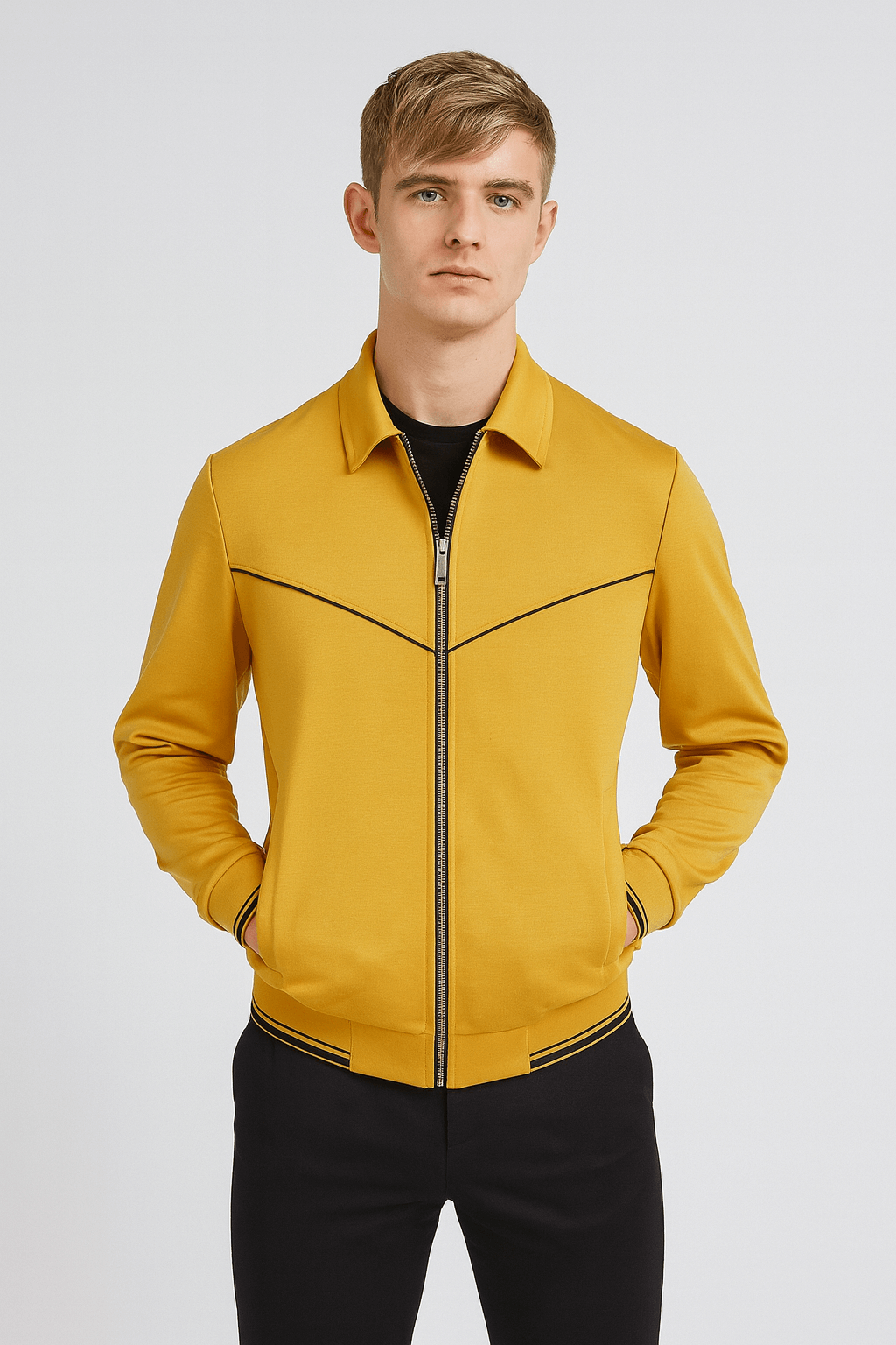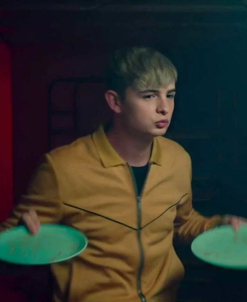 Inspired by the British spy series Alex Rider, this Otto Farrant yellow bomber jacket is worn by Alex Rider. Crafted from premium fleece with a soft viscose lining, it provides comfort and warmth. Featuring a shirt-style collar, front YKK zipper, rib-knitted cuffs and hem, and front pockets, this jacket is perfect for casual wear and fan-inspired style.
