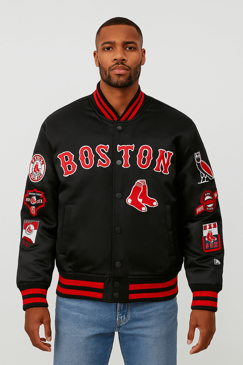 Show off your team spirit in style with the OVO MLB Boston Red Sox Replica Black Varsity Jacket. Crafted from premium satin with a smooth viscose lining, it ensures both comfort and durability. The rib-knitted collar, cuffs, and hem give it a classic varsity look, while the buttoned closure adds timeless appeal.