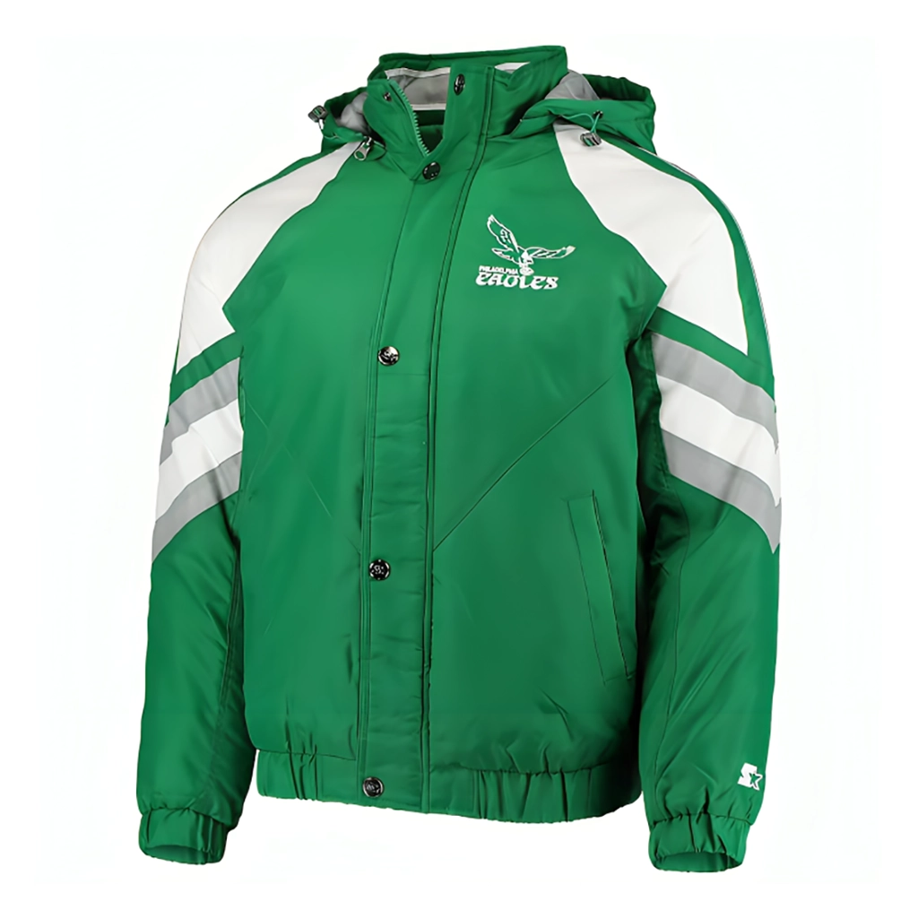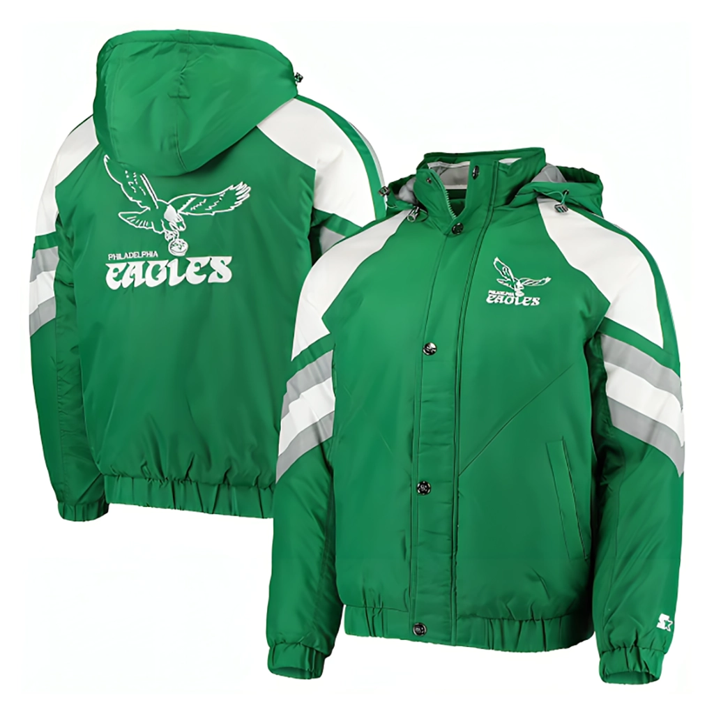 Show your Eagles pride in style with this throwback green raglan jacket. Made from durable cotton and polyester with a soft viscose lining, it offers comfort, breathability, and long-lasting wear. Featuring a hooded collar, front zipper with button closure, and full-length elastic cuffs, it’s perfect for game days or casual outings.