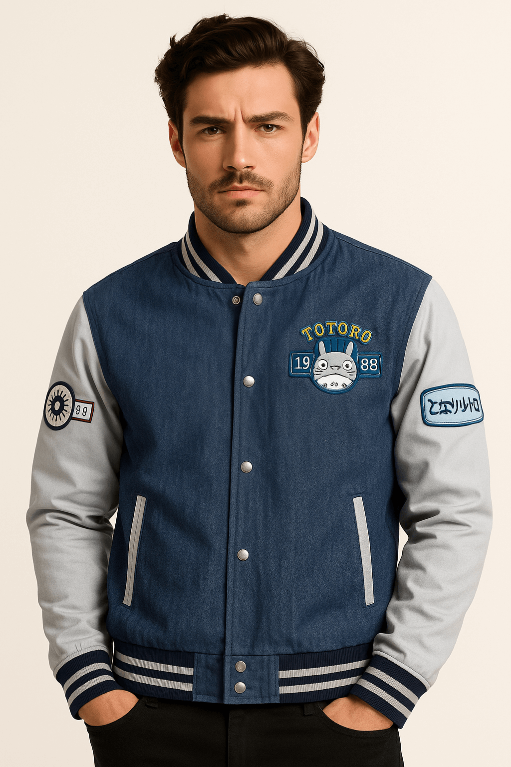 Featuring a rib-knitted collar, snap-tab buttoned closure, and two convenient side pockets, it combines casual style with functional design. The charming circle portrait of Totoro adds a playful, nostalgic touch, making it perfect for fans of the iconic anime. Ideal for layering or showcasing your love for Studio Ghibli in a stylish way.