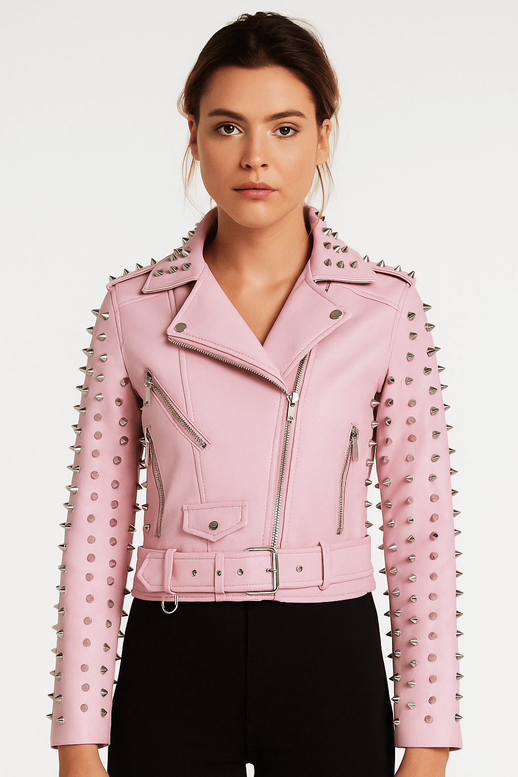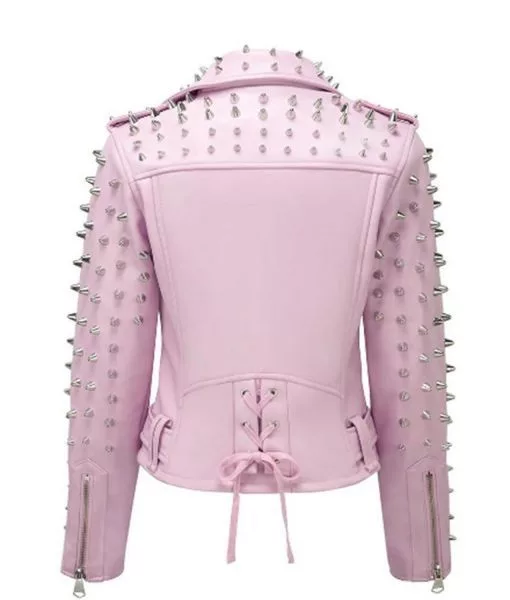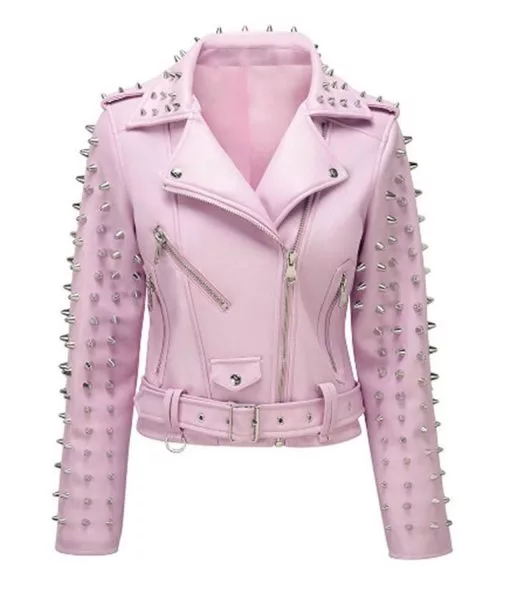 This Women’s Hot Pink Motorcycle Leather Jacket is perfect for every occasion casual gatherings, hangouts, Halloween parties, fantastic gifts for birthdays, working, celebrations, holidays and Christmas, sporting, and so on. Channel your inner riding style and develop a new sense of style in this fashionable attire. Made from real leather, and is offered in a magnificent outlook that gives it an elegant and contemporary appearance. The lapel-style collar and branded zipper closing are features of the leather jacket with studs. The Pink Studded Leather Jacket has long, fitted sleeves that have zipper cuffs and shoulder epaulets. Three zippered pockets on the apparel allow for storage. The belt at the hemline of the attire gives it a tailored appearance. A cozy viscose lining lines the interior of this outfit for comfort and warmth. Silver studs on the outfit give it an edgy appearance.